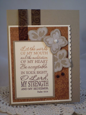 I have started to rely heavily on sketches to get me started. In fact, I have a sheet in my planner that is full of sketch challenges and color challenges and I'll often combine them if I can. For this card, I knew I wanted to use the Viva La Verve sketch #5 with a twist of texture. With the size of the rectangular panel, I decided to use the set Meditations, because I love it and haven't used it enough. I wanted to give the perception of a circle behind the image panel, so I stamped two of the flowers in the set a few times in PTI Fresh Snow ink on Kraft cardstock and cut them out. For awhile all the pieces just lay on my cardstock base, until I can see what "works". I wanted some variation in color, but I also wanted to keep it predominately brown, so I inked up my sentiment stamp with caramel ink, then cocoa, then chocolate chip. With the varigated sentiment, the lighter background paper, and the darker ribbon, there is plenty of variation to make it interesting, but it still looks "monochromatic", so it is soothing to the eye. To add texture to my card I popped up the main panel which put one layer of ribbon higher than the other. I also popped up some of the flowers.